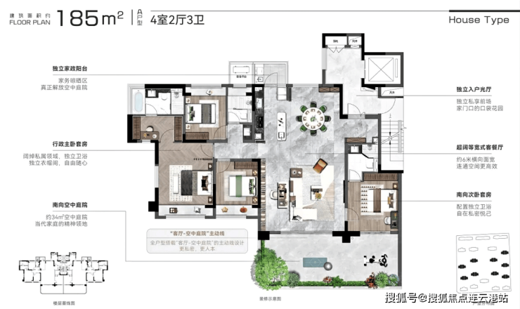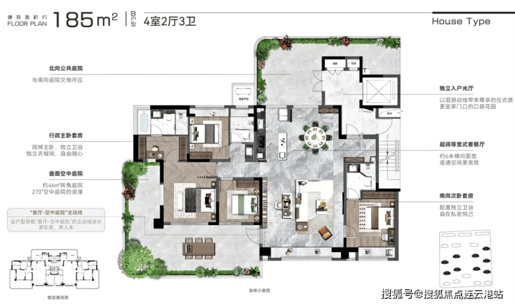 建面185㎡的奇数层户型,巧妙解锁多元生活空间:南向空中庭院与客厅无缝衔接,营造出“超级庭院”,突破传统空间限制,将自然美景融入居家生活,打造极致舒适的生活娱乐场景,开启无限可能的居住体验。
