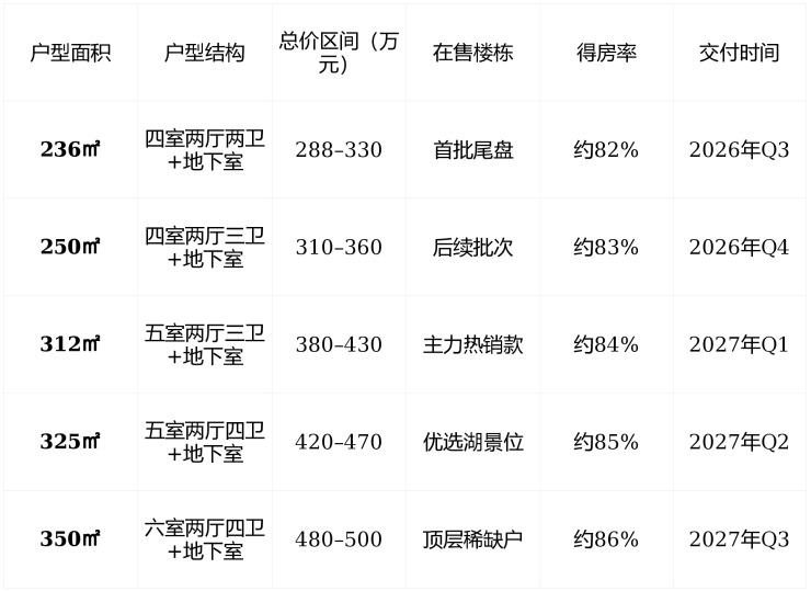 ✅ 温馨提示 : 236–312㎡户型 仍有余量, 325㎡以上 户型稀缺,建议优先锁定 南向庭院+地下层采光好 的房源。