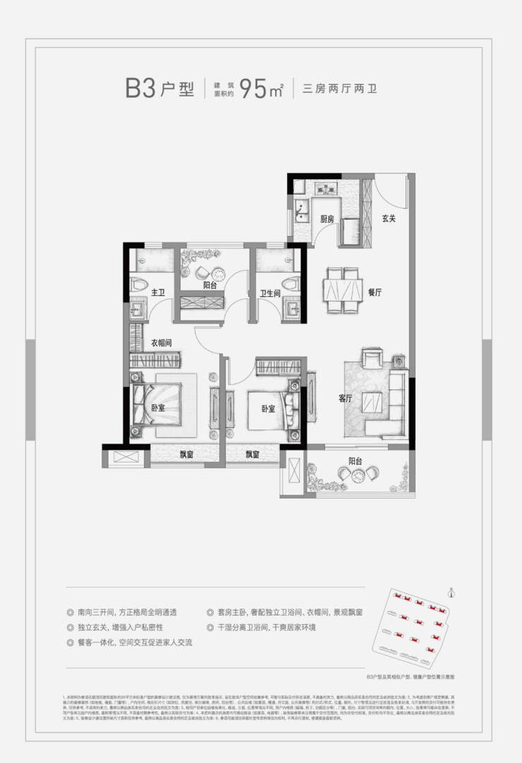 户型设计:三开间朝南、动静分区,部分户型含飘窗及阳台赠送面积。