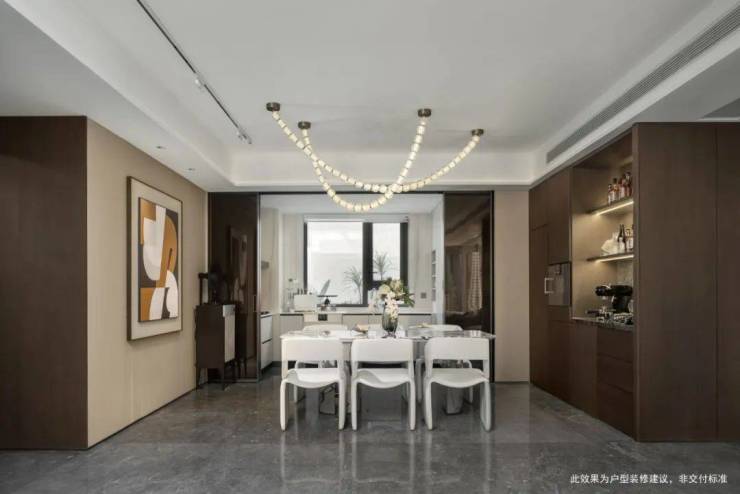 这个户型四开间朝南,形成约15.95m奢阔面宽。南向约5.95m的客厅、餐厅以及阳台的一体化布局,不仅动线流畅、通风及采光体验更佳,更能容纳多种生活场景,组成潮流感十足的LDKB互动空间。