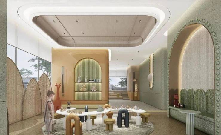 高层的一楼设置了全维架空空间,包括室内型的社区客厅、U-YOUNG空间、红叶空间、奇妙空间等主题空间,以及室外型的疗愈花园、儿童活动、休憩花园、自然学堂等空间。
