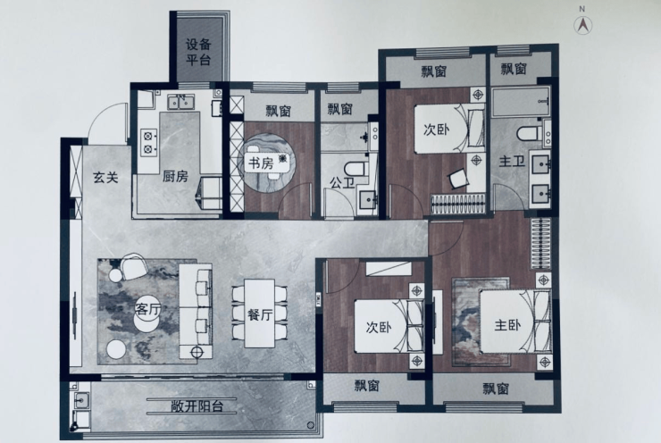 户型:主推143㎡-180㎡大平层,含四房两厅两卫/三卫设计,南北双阳台,得房率约85%