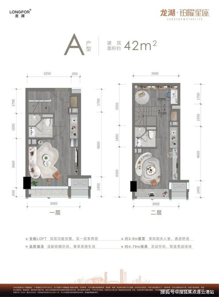 绝版产品设计:主力推售建面约42-64㎡精装双钥匙LOFT,层高约4.79米,可分层打造独立生活空间(如楼下社交、楼上休憩),实现"买一层享两层"的功能分区,得房率约67.21%