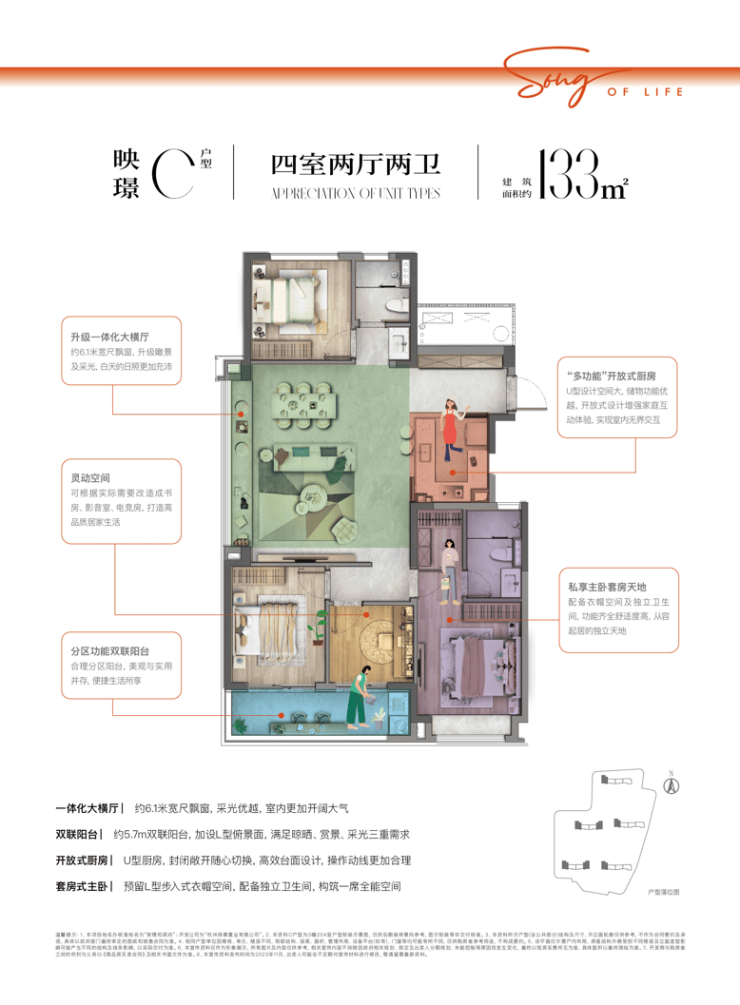建面约133㎡四房:大横厅布局,边套设计,主卧套房带独立衣帽间与卫浴,空间开阔 。
