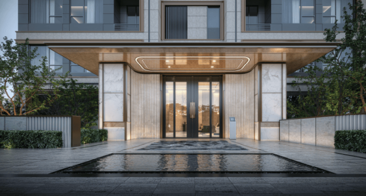 建筑立面选用米白与暖灰的现代轻奢色系,铝板+一体板等材质组合使用,搭配超大窗墙比,简约线条设计,彰显现代质感美学风格,历久弥新。