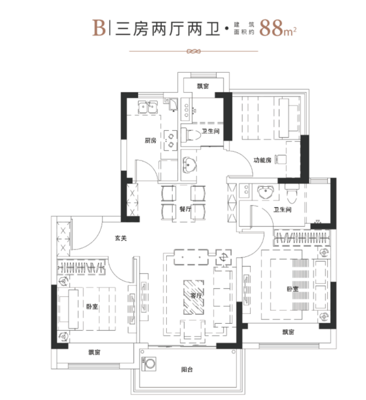 得房率80%–83%88㎡户型实际使用面积接近普通95㎡高层