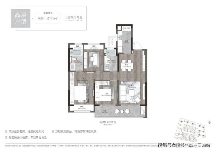 高层105平户型:三室两厅两卫,总价150-165万