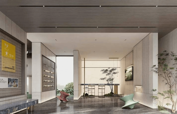 立面是判断一个小区品质很好的维度。浦上悦庭在建筑立面上作了升级,采用一体板、真石漆、铝板和石材为主要材料,并且采用折面框架上下穿梭于建筑主体和屋顶,形成了具有现代感和韵律的建筑造型。