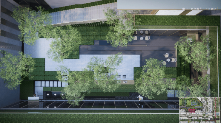 社区景观 中央园林+架空层 项目内部 绿化率31.5%,“一轴三园五境”设计,水景、灯光、四季花木错落有致