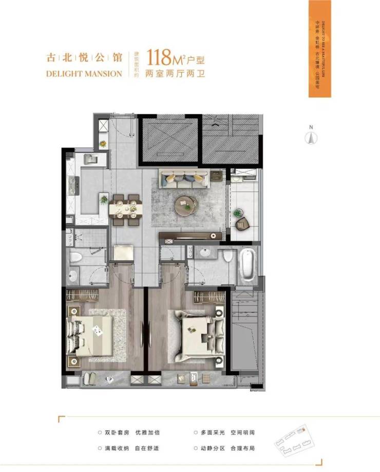 118㎡两房两厅两卫:南北通透全明格局,双套房设计,主卧卫浴面积达9平方米