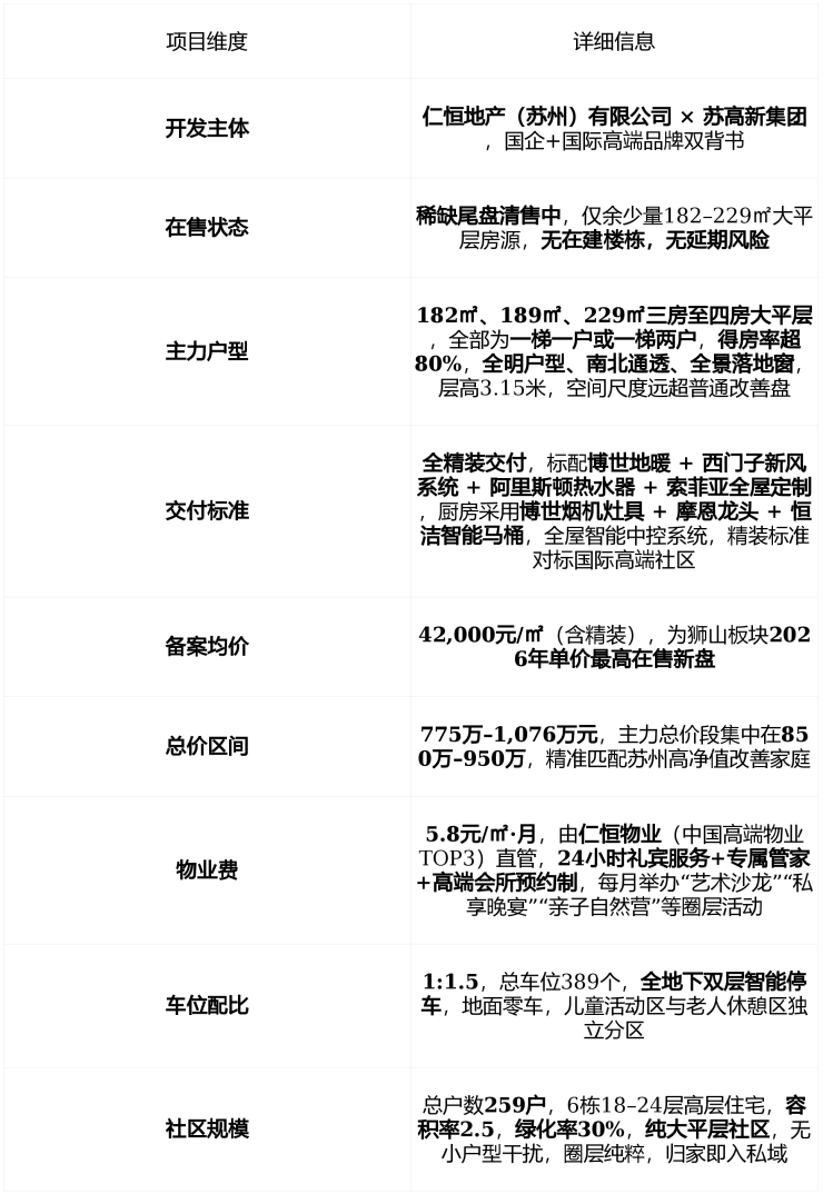 苏州狮山核心区唯一在售的纯大平层社区 , 42,000元/㎡单价+182–229㎡奢阔户型 , 双巨头仁恒×苏高新联袂打造 , 步行700米直达地铁1号线 , 对口新区实验小学+新区一中 , 1.1公里即达明基医院 , 3公里内环抱龙湖天街、大阳山、白马涧 —— 不是改善,是跃迁 。