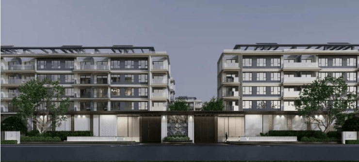 精装标准≥1500元/㎡,外立面采用深灰色铝板+LOW-E玻璃