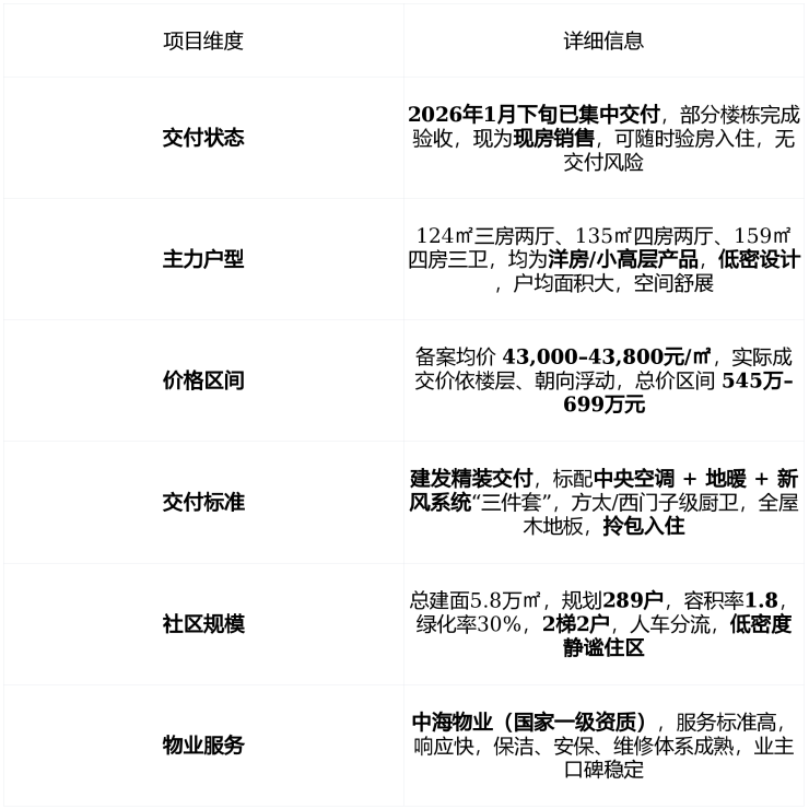 在售状态 : 2026年1月下旬集中交付 ,现为 现房销售 ,剩余主力户型为 124–159㎡洋房/小高层 ,备案均价 43,000–43,800元/㎡ ,总价 545万–699万元 。