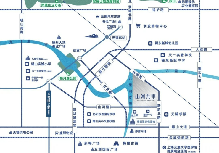 ### 交通出行公交出行十分便捷,您可乘坐 727 路公交,在新韵路(山河路)站下车;或搭乘 811 路公交,于滨江学院(西大门)站下车;还能乘坐 777 路、锡东微 3 线公交,在和祥路(润锡路)站下车。地铁出行的话,地铁二号线的映月湖公园站可满足您的需求。### 周边配套1. **餐饮**:周边汇聚了众多美食店,有无锡朝天门火锅(无锡安镇店)、杨铭宇黄焖鸡米饭(新华路店)、苗小坛酸汤鱼等,能满足不同食客的口味需求。2. **银行**:有华夏银行(无锡锡东支行)、广发银行(锡山支行)为您提供金融服务,还有华夏银行 24 小时自助银行(锡东支行)方便您随时办理自助业务。3. **医院**:无锡市锡山人民医院就在附近,为您和家人的健康保驾护航。4. **超市**:德购生活超市、红豆平价超市、恩典 365 便利超市等满足您日常购物所需,无论是生活用品还是食品采购,都能轻松实现。5. **学校**:教育资源丰富,无锡市锡山实验小学、华夏天一双语学校、无锡市协和双语国际学校提供优质的基础教育,江苏省锡东中学 - 南门也为学子们提供良好的学习环境。6. **药店**:天润医药连锁、安心堂药房、奇天大药房等药店,方便您购买日常药品。7. **休闲**:闲暇时光,您可以前往纵横国度网咖享受网络乐趣,到 RJ 健身工作室锻炼身体,或在印象瑜伽(安镇店)感受身心的放松。8. **卖场**:红豆万花城(锡东店)和润发购物中心,各种商品琳琅满目,能满足您的购物休闲需求。9. **公园广场**:映月湖公园景色宜人,是您散步、休闲的好去处。☎️售楼专线:4009983632 ☎️山河九里建面约 89㎡户型图