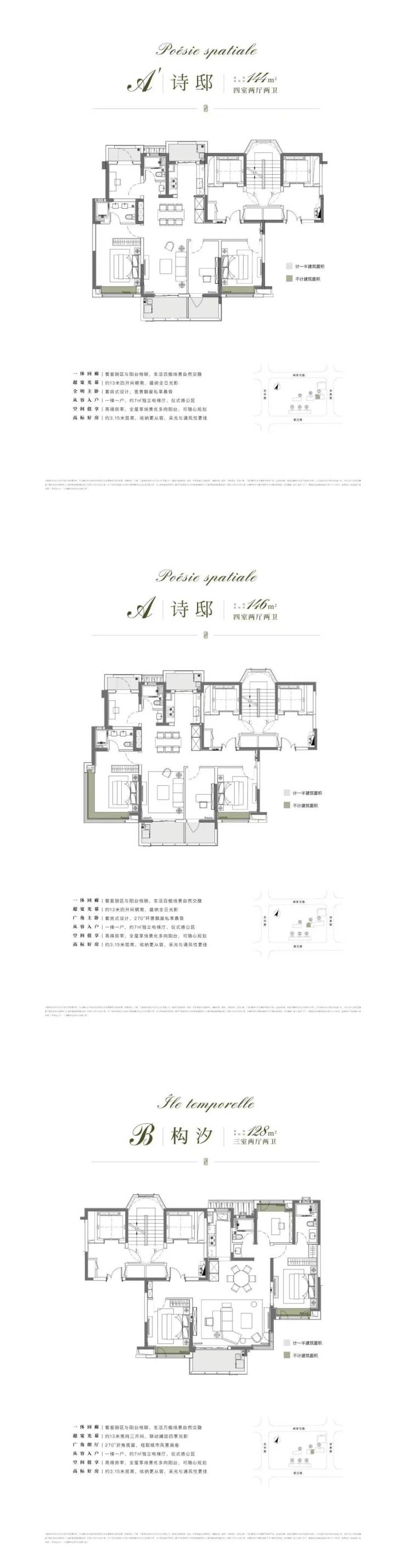 128-146㎡四房两卫:南北通透全明格局,部分户型配备270°转角飘窗
