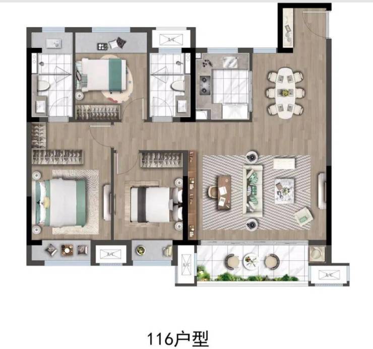 建面约116㎡四室两厅两卫:总价142万起,四开间朝南,方正通透,灵动空间设计