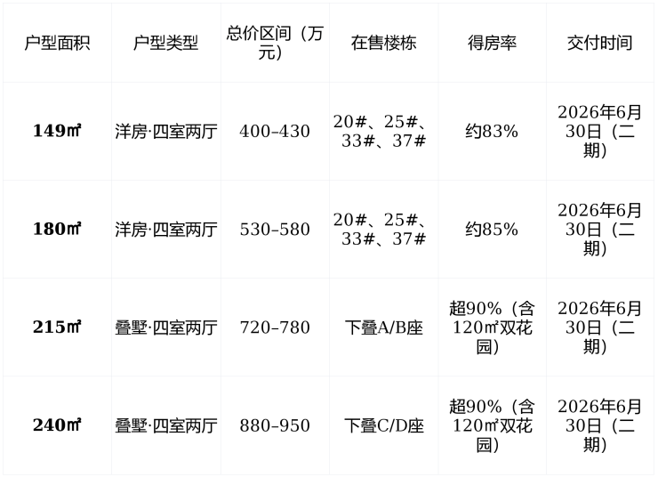 ✅ 温馨提示 : 149㎡洋房 为当前主力成交户型, 215㎡下叠 因双花园稀缺,已进入“选位尾声”,建议优先锁定南向湖景单元。