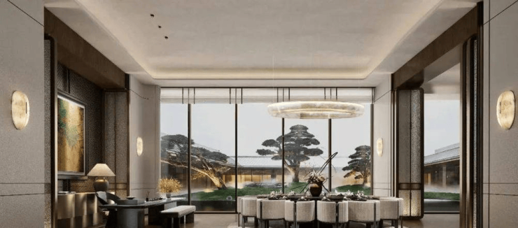 建筑美学:融合飞檐画栋、古铜色调等东方形制,搭配金属石材立面;