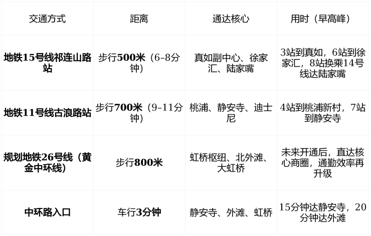 从项目出发, 步行8分钟上15号线,11分钟上11号线,3分钟上中环 ,早高峰通勤效率优于普陀区96%新盘。