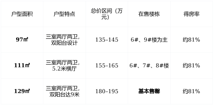 购房建议 :97㎡适合刚需家庭,111㎡是改善首选,129㎡已稀缺,建议优先锁定 朝南、临园、低楼层 房源。