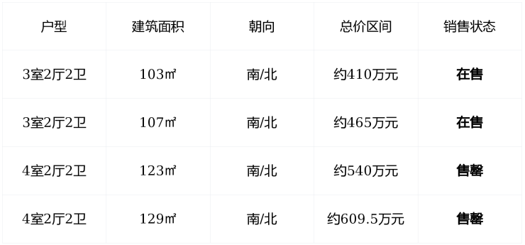 在售户型 :主力在售为 103–107㎡ 三房 ,总价 410–465万元 ,均价约 45,200元/㎡ ;123–129㎡四房已售罄。