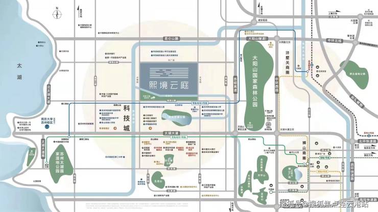 熙境云庭与公共交通的连接较为紧密,具有较大的出行优势。其西北侧规划有轨道交通,据此前公开资料,距离轨交 9 号线青山路站(规划中)仅约 50 米。尽管目前 9 号线尚未建成,但未来通车后,居民乘坐地铁可快速抵达苏州的多个区域,极大地提升出行效率,加强与城市各处的联系。同时,项目距有轨电车 1 号线站点不远,大约 700 米左右,有轨电车 1 号线串联起科技城内众多重要区域,方便居民在科技城范围内进行通勤、办事以及休闲等活动。