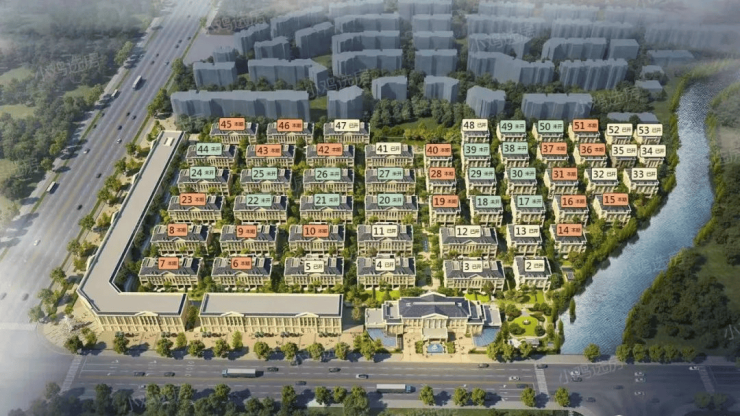 住宅部分由25幢四联排、27幢双联排组成,面积段为183-352㎡,