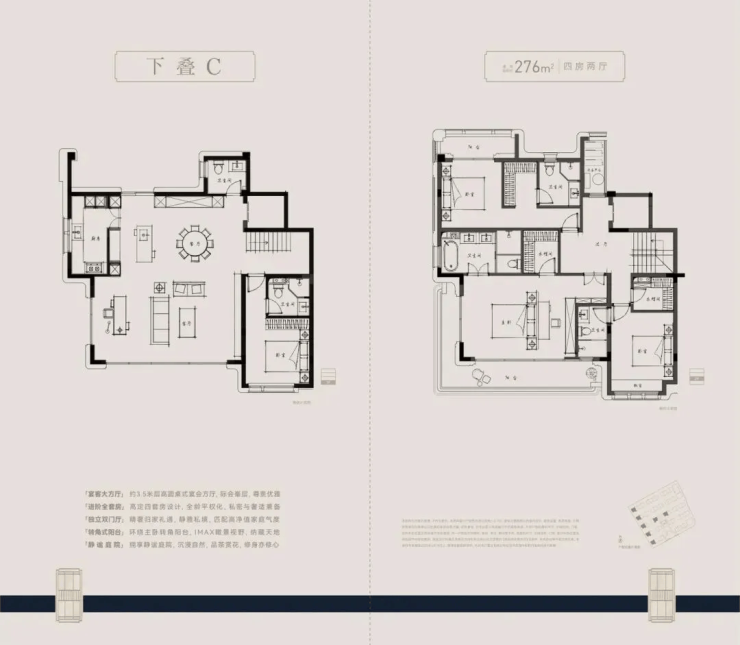主力户型:建筑面积约 210–280㎡,全套房设计,上下叠独立入户
