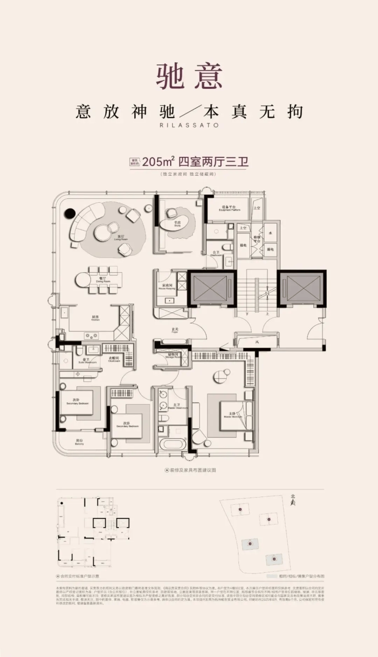 205㎡四房三卫:层高3.15米,270°环幕转角厅直面运河,主卧套房配备步入式衣帽间与双台盆卫浴,玄关“800库”收纳可容纳百双鞋履。