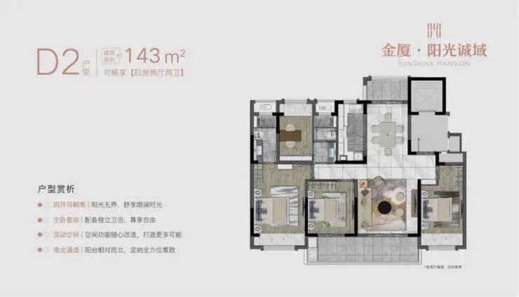 户型:主力为建面108-143㎡三至四房,其中108㎡横厅户型(B1户型)以6米开间、双卫设计为亮点。