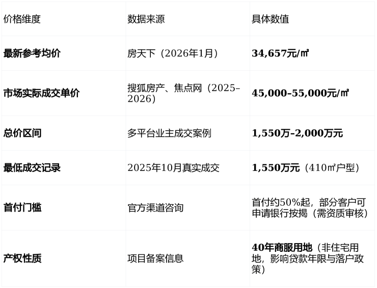 ✅ 关键提示 :当前市场成交价已稳定在 4.5万–5.5万/㎡ 区间,远高于早期宣传的“精装标准”,购房者需明确区分“装修投入”与“房屋总价”。60席稀缺性支撑高溢价,无明显折扣,成交以全款或高首付为主。