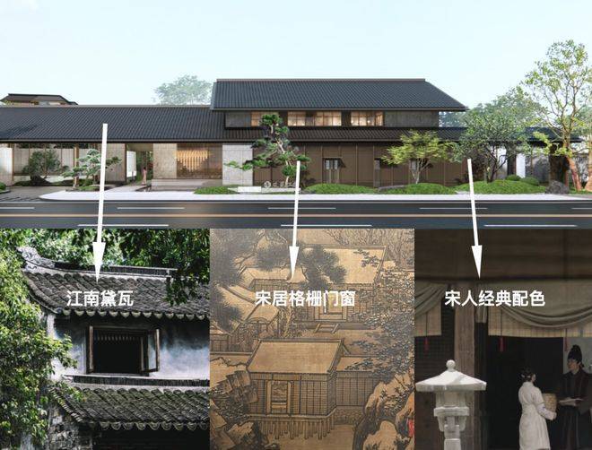 示范区承袭香山帮传统技艺工法,将宋风大宅与苏州在地文化融为一体。从主入口的黑松、门亭香山"细石匠"工艺到园内的地铺、小品,景墙端头点缀转译回纹、云纹、万字纹等经典东方符号,木坐凳以瑞兽花卉为蓝本雕刻,体现江南园林的精巧