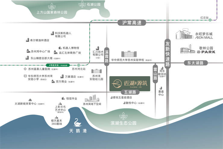 轨道交通:项目周边轨道交通规划前景广阔。直线距离约 800 米处,在建的地铁 7 号线天鹅荡站预计 2025 年 12 月正式运行,届时将为居民出行带来极大便利 。目前,距离较近的苏州湾北站属于地铁 4 号线支线,直线距离约 1.2 公里 ,乘坐 4 号线支线可快速抵达苏州湾核心区域。不仅如此,根据长远规划,未来 12 号线和 15 号线也将在此区域设站 。多条地铁线路交汇,意味着居民无论是前往苏州火车站、园区等城市重要节点,还是在吴中太湖新城内部穿梭通勤,都能轻松实现快速出行。例如,居民乘坐 4 号线支线后,可便捷换乘 7 号线,进而前往相城等区域,真正实现畅达全城,极大节省出行时间成本 。
