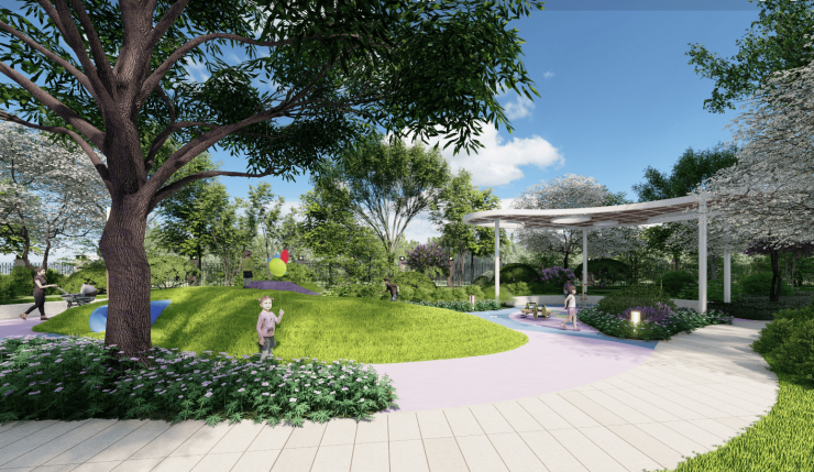5大景观组团:中央公园、艺术廊架、阳光草坪、林荫步道、儿童多龄游乐区