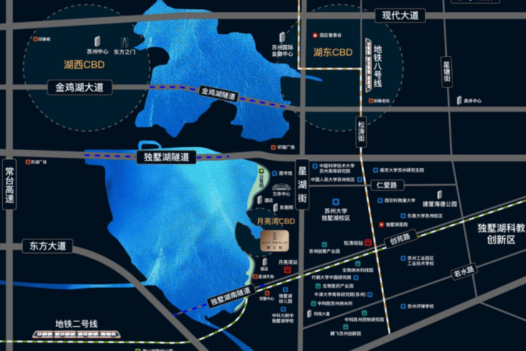 地段占位核心:项目坐落于月亮湾路与崇文路交汇处,扎根“苏州硅谷”——独墅湖科教创新区,汇聚华为、微软、信达生物等高科技企业与研发机构,高端人才密集,区域发展潜力强劲 。
