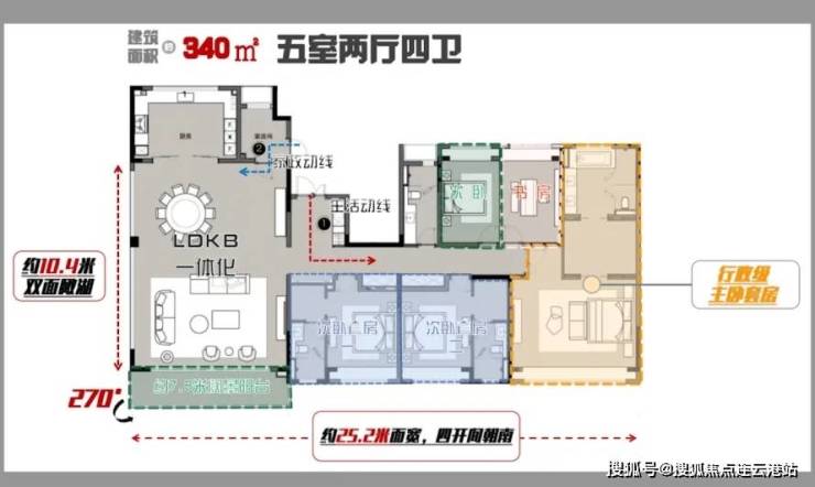 该户型位于西边户,6开间朝南25.2米,西侧餐客一体设计,客厅开间7.8米,主卧开间6.4米,南套房开间3.6/3.6米,北次卧开间3/3.1米,厨房开间6.3米。