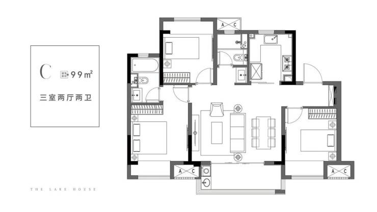 99㎡三室两厅两卫(洋房C户型):独立玄关,厨卫全明,总价约139万元起