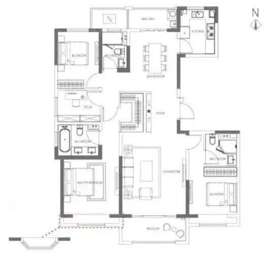 在售面积段144-173㎡三到四房。