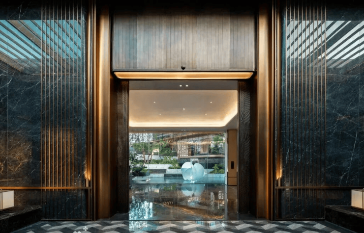 主入口知·云栖,取意西湖十景以"洄游"为理念,超52米跨度的回字形布局,重构传统"四水归堂"空间序列,约2.4米“流光礼宾” 塔冠,如悬浮的美学灯塔,与金色挑檐相映成辉,全封闭式阳台勾勒建筑轮廓,让立面如镜幕般收纳约30公里江岸鎏光!
