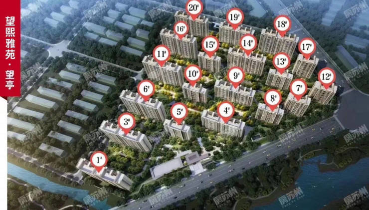 望熙雅苑位于苏州市相城区望亭镇御亭路与问渡路交汇处,由苏州金悦璨房地产开发有限公司(碧桂园、保利、正荣、金地、中粮联合开发)打造,总占地面积9.58万㎡,建筑面积19.17万㎡,容积率2.0,绿化率37%,规划19栋14-18层高层住宅,共1904户,车位配比1:1.32(共2581个车位),物业由正荣物业(国家一级资质)负责,物业费2.33元/㎡·月