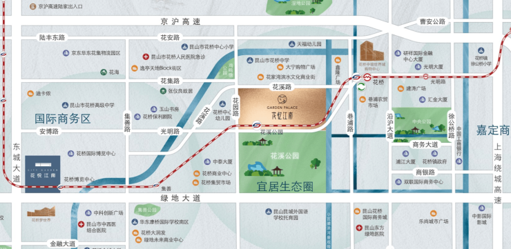 地铁:步行150米即达苏州轨交11号线“花溪公园站”,4站直达上海嘉定,15分钟抵达虹桥枢纽,真正实现“沪苏同城”。