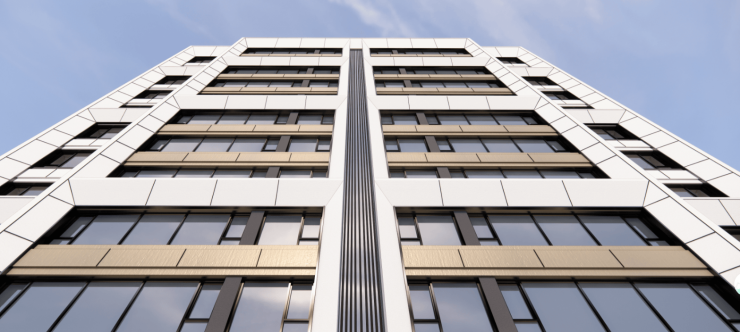 外立面设计:采用局部铝板、石材、真石漆与镜面玻璃,质感高级,彰显现代人居美学