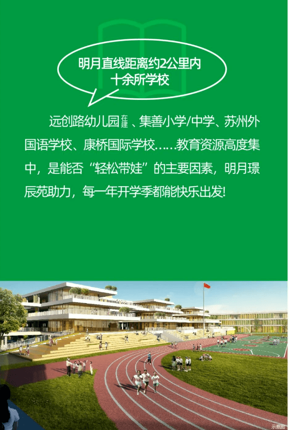 直线3km范围内有12个幼儿园; 6个小学,如昆山市花桥集善小学、陆家中心小学东校区、花桥中心小学校、花桥新建外包区公办小学、花桥金城小学等; 11个中学,如陆家高级中学、昆山新昆洋学校、苏州外国语学校昆山校区、昆山昆城外国语学校、晨光文具集善学校等。