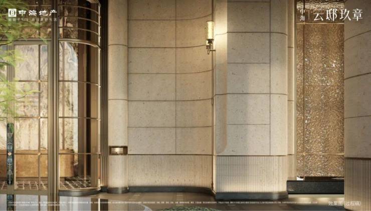 主入口约7米高约40米宽的奢华门头、挑高式的古铜色星空顶,地面选用天然大理石交织,进一步增强归家落客区的奢华感。