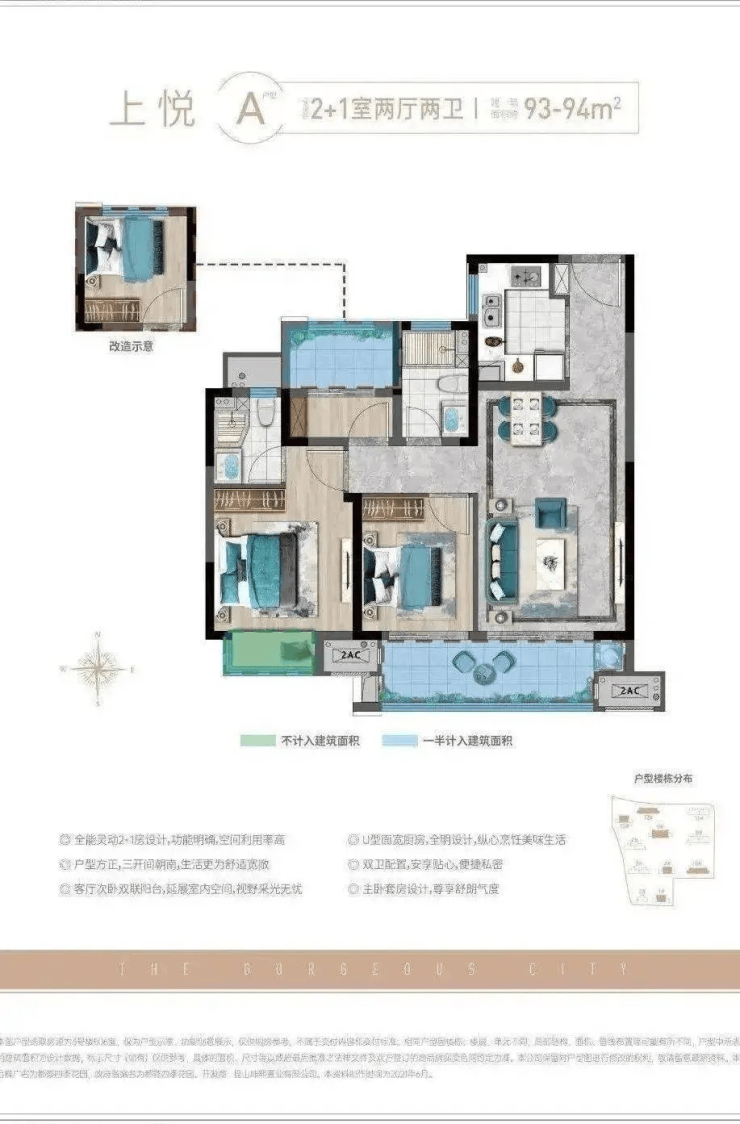 93㎡ 三室两厅两卫:南北通透,得房率高