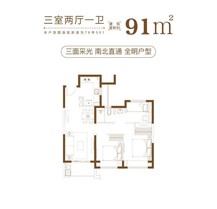 建筑面积约84-101㎡瞰景高层,方正格局,正向朝南,采光性和通风性都非常优秀;动静分离、干湿分离更是不在话下;而且推窗便能看见高尔夫绿洲,视野极为优越!