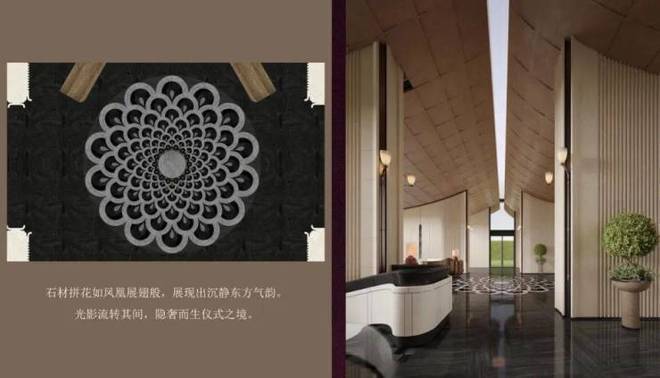 在整体精装设计中,“凤翎”作为精神图腾,从屋脊天花的羽翼纹理,到石材拼花的连绵凤羽、门把手的精妙装饰,乃至地下光厅地面凤羽拼花与穹顶光影的上下辉映,凤翎符号于不同尺度、材质中流转升华,无不彰显这片“凤起之地”的精神共鸣。