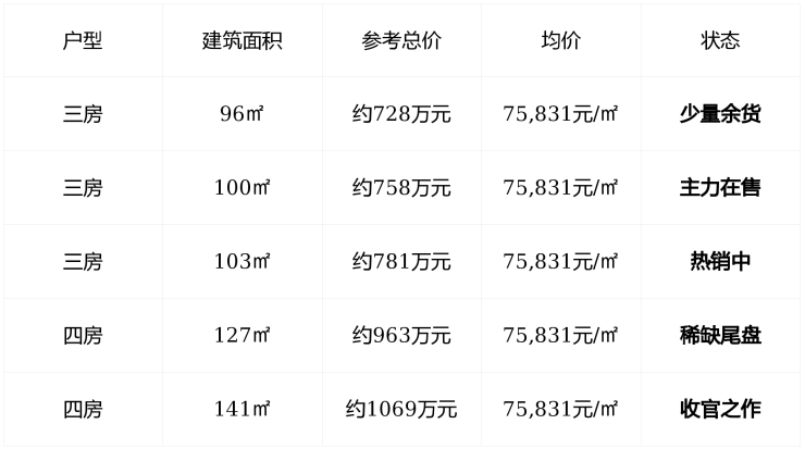 整体均价:约75,831–76,000元/㎡,低于政府指导价79,000元/㎡,具明显价格倒挂优势;剩余房源:仅剩不足50席,主力户型已售超90%,进入“买一套少一套”清盘阶段;交房时间:2026年12月(精…
