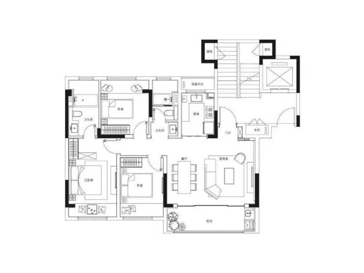 建面约148㎡的户型,为3开间朝南,超大横厅+南向大阳台,尺度相比约105㎡有所增加。北向新增一个次卧,同样都带有飘窗。而且主还有270°转角,视野更好,并带有独立卫生间,主人的私密性也能有所保障。