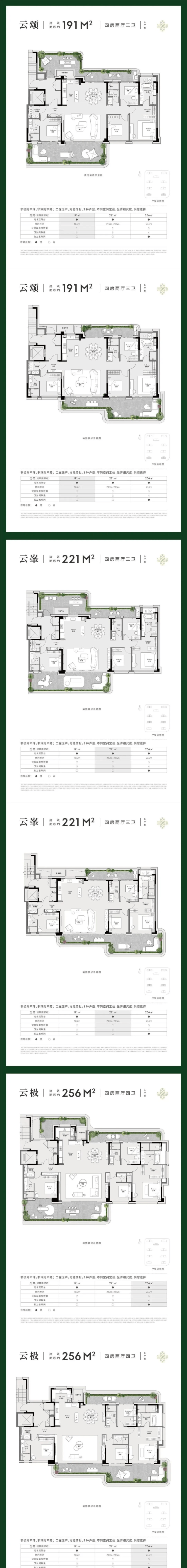 户型:建面约191-256㎡大平层,南向最大面宽23.2米,配备双阳台、空中花园及垂直庭院